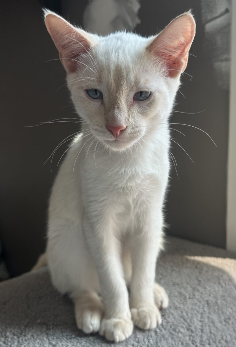 Hi there! I’m Reno, the goofiest kitten you’ll meet. My days are filled with playful antics and funny moments that keep everyone laughing. I love making new friends and am always up for a game or a cuddle session. If you’re looking for a furry companion who will bring joy and laughter into your home, I’m your guy! Why not come by and meet me? I’m sure we’ll have a blast together!