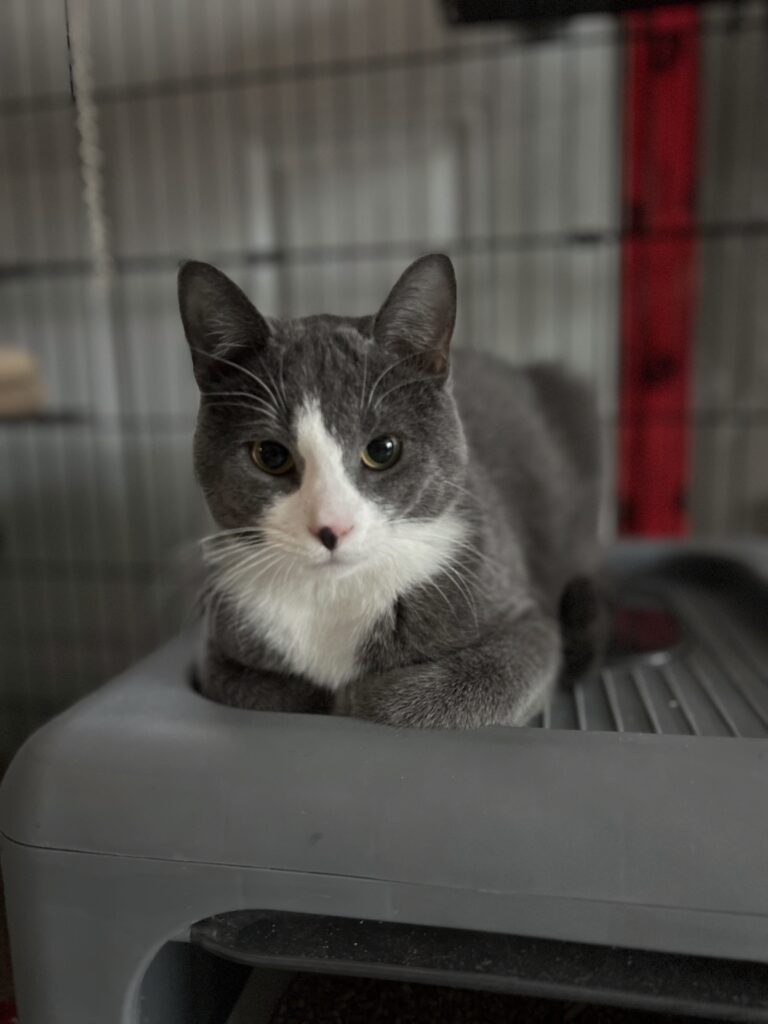 Hi, I’m Steve, a handsome young grey tuxedo with a thoughtful soul. At just under a year old, I am a professional observer who likes to keep a watchful eye on things while I get to know you. While I might be a little shy at first, don’t let my quiet exterior fool you. Once I feel safe, my playful teenage spirit truly shines.
